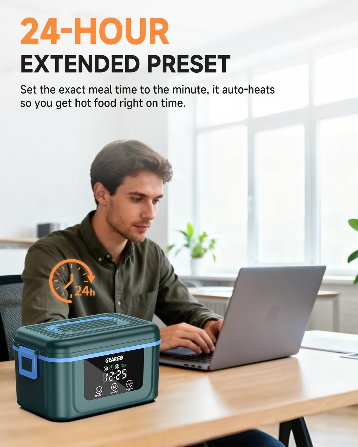 The powerful 24000mAh battery provides 3-4 full heating cycles per charge. That's enough for a full work week of hot lunches. Charging takes 4-5 hours using the included USB-C cable.